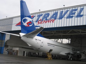 Nový Boeing 737-86Q (OK-TVE, výr. č. 30294) Travel Service odpočívá po dodávacím letu 20.03.2004 v hangáru společnosti