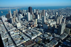 Pohled na Russian Hill, Nob Hill a Financial District z Bell 206SF Helicopter Tours - výška cca. 200 m