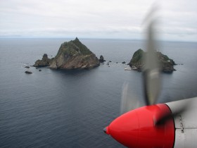 Letadlo Kim´s Solution nad ostrovem Dok-Do asi 250km od pobřeží. Jsou zde i dva heliporty, využívané převážně vrtulníky Mi-8 Costal Guard