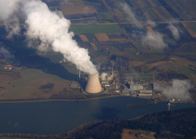 Atomová elektrárna Isar blízko Landshutu, pohled při přiblížení na dráhu 08L v Mnichově.