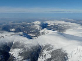 Na četné (ústní) dotazy upřesňuju - je to focené od Pece pod Sněžkou na severozápad, vpravo je Luční hora, Krakonoš, dál vybíhají Kozí hřebety, chata Výrovka, za ní v ďolíku uprostřed Špindl, za ním Medvědín a dál Zlaté návrší, vpravo do něj Labský důl, vlevo Horní Mísečky. Ještě dál vlevo Kotel a Lysá Hora, pod Kotlem Kotelní Jámy, za tím je ještě vidět Čerťák v Harrachově se sjezdovkou.