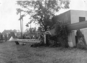 Nehoda při Krajských plachtařských závodech v Liberci. Pilotka se vracela na letiště před blížící se bouřkou a zapomněla na vysunuté brzdící klapky. Když si svoji chybu uvědomila, bylo již pozdě. Narazila v Liberci-Františkově do trafostanice. Při příjezdu na místo nehody jsme byli velmi rádi, že stála u kluzáku téměř bez zranění. Foto archiv.