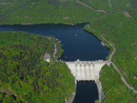 Ještě pro zajímavost - ty dvě žluté bóje před hrází zhruba označují polohu druhé, skoro 30 metrů vysoké hráze, která je v těchto míslech "utopená". Sloužila v době výstavby k přhrazení toku a odvedení vody do obtokového tunelu a už tam zůstala.