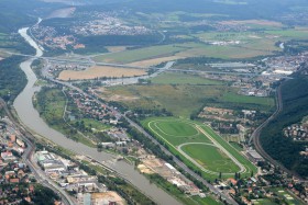 Soutok Vltavy a Berounky u Zbraslavi a Radotína před přistáním na RWY 31 v Ruzyni. Vlevo křižovatka Pražského okruhu a Strakonické, vpravo dostihové závodiště v Chuchli a železniční trať Praha-Plzeň.