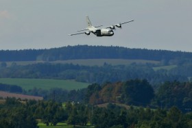 Hercules na průletu benešovskou "Mach loop". Spojenecké letectvo využívá benešovské letiště ke cvičným letům.