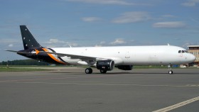Původní A321-200F Titan Airways s registrací, dříve používanou na B767-300 Austrian Airlines, krátce po příletu na změnu laku.